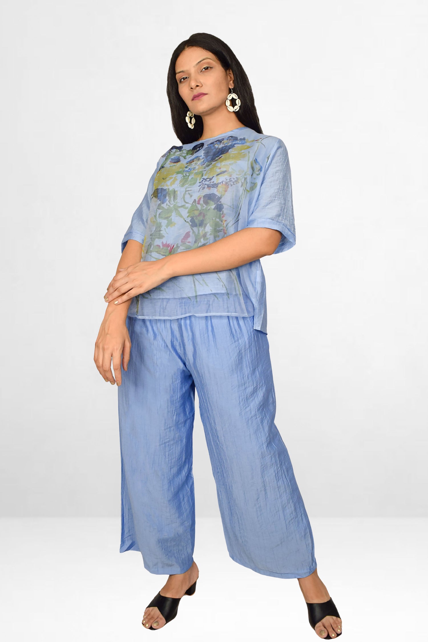 Step into effortless elegance with our Blue Co-ord Set, a lightweight ensemble designed for comfort and sophistication. This two-piece set features a breezy, semi-sheer top with short sleeves and a relaxed fit. A delicate, nature-inspired floral print in soft hues adorns the front, adding an artistic touch to the look.