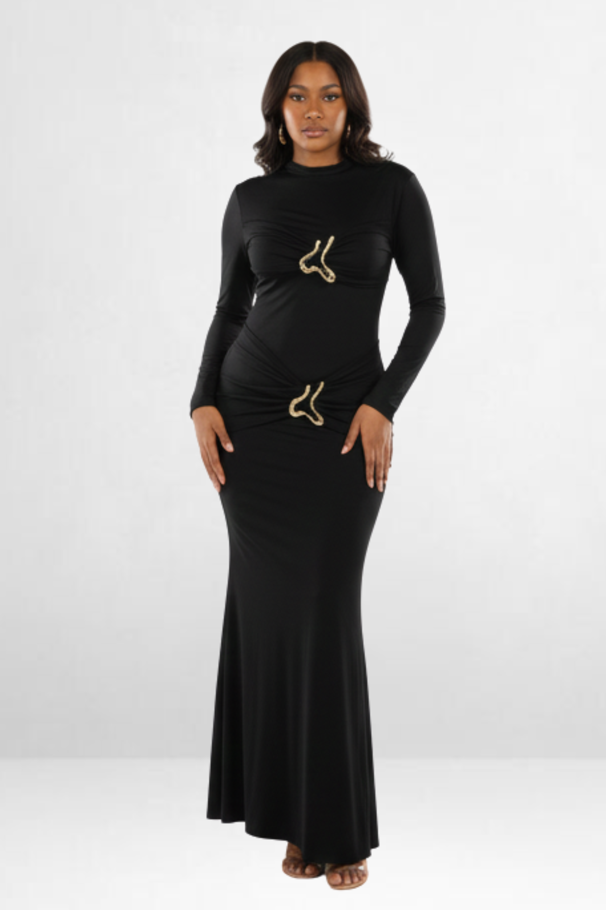 Two statement gold-toned hardware accents highlight the ruched waist detailing, drawing attention to the midsection while creating a flattering hourglass effect with artistic flair. -