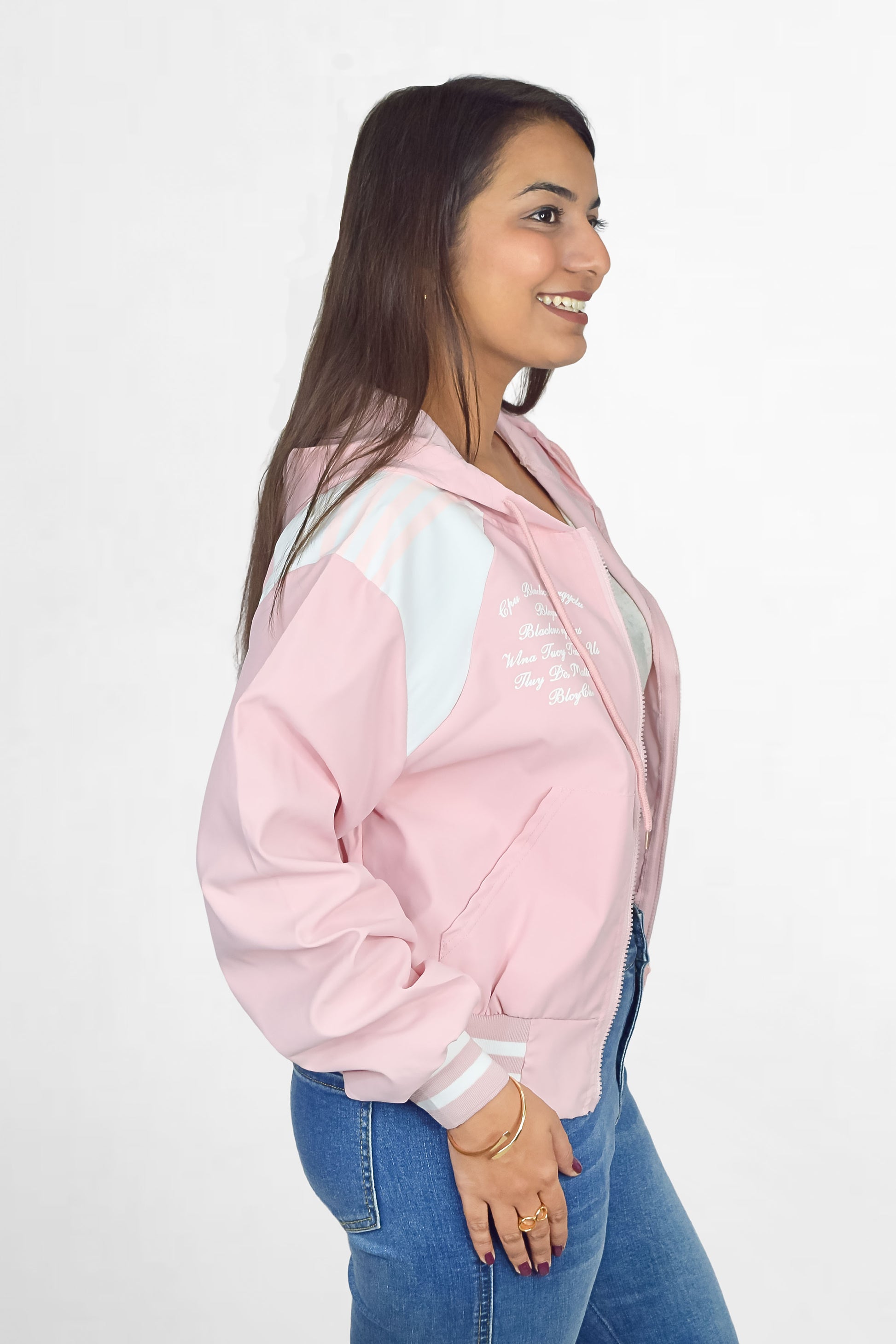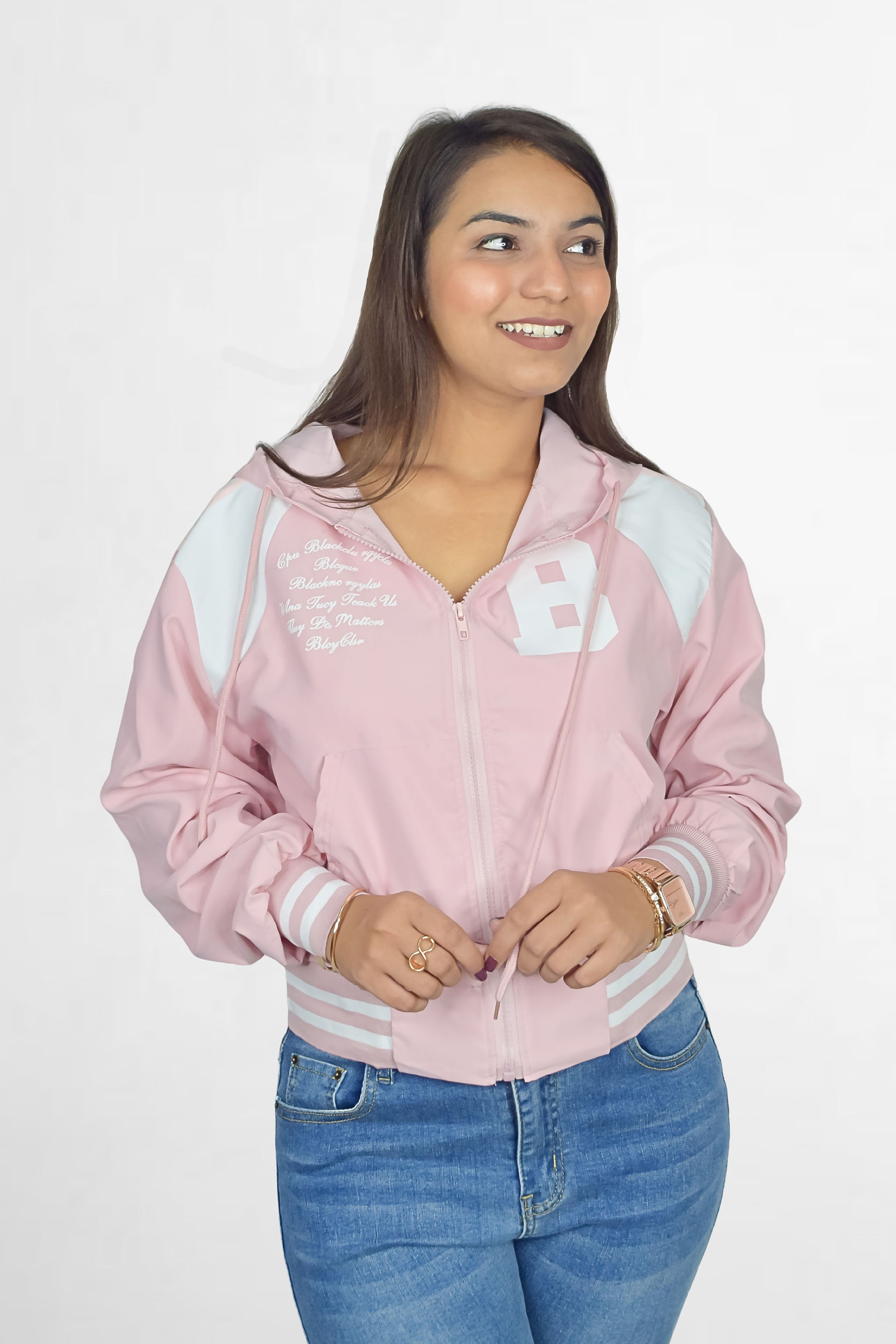 - Playful Athleisure – This cropped bomber jacket brings a youthful sporty vibe with its varsity-inspired stripes and relaxed silhouette. The subtle embroidery and letter patch detail add a fun, collegiate twist to your look.