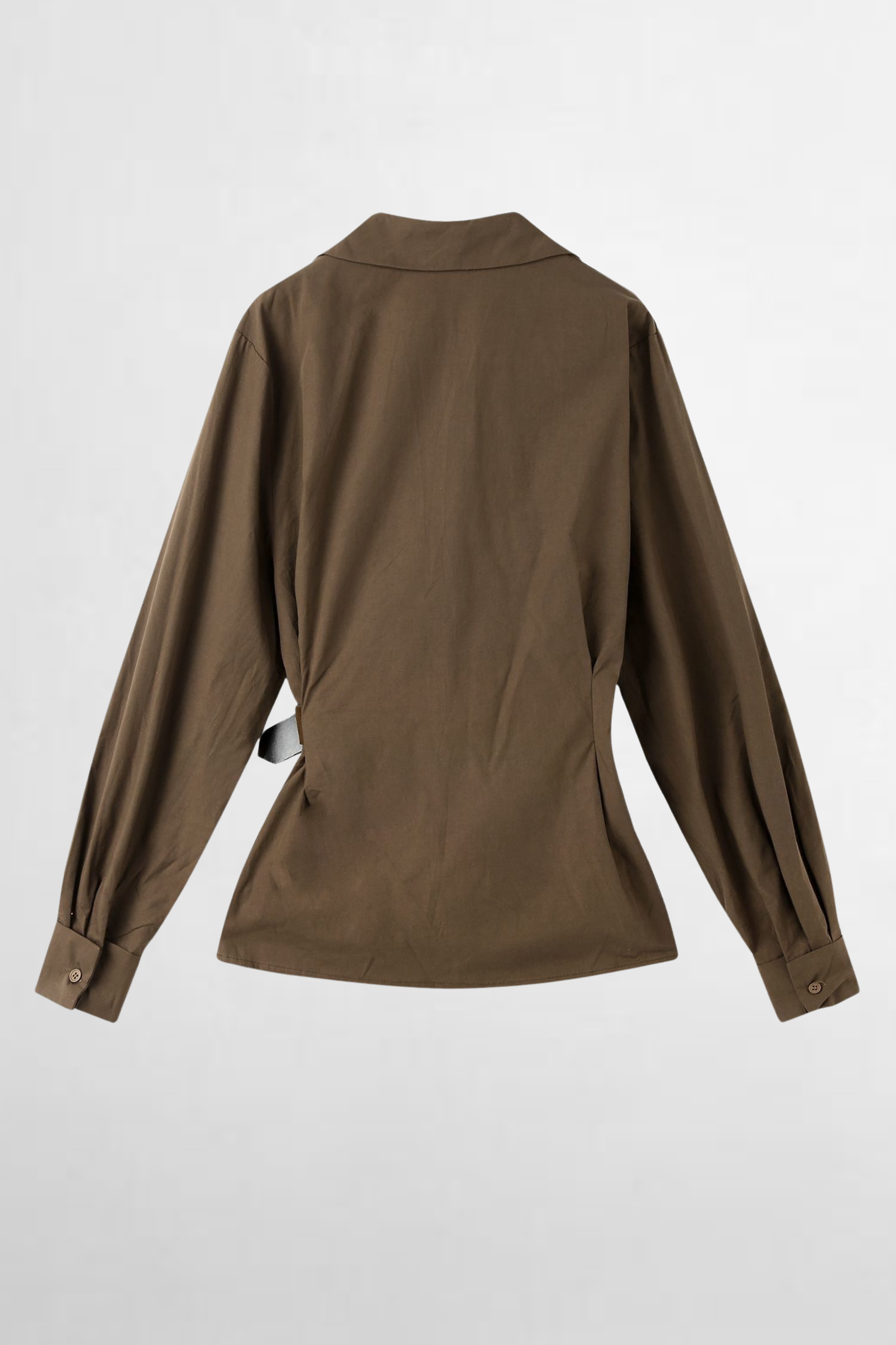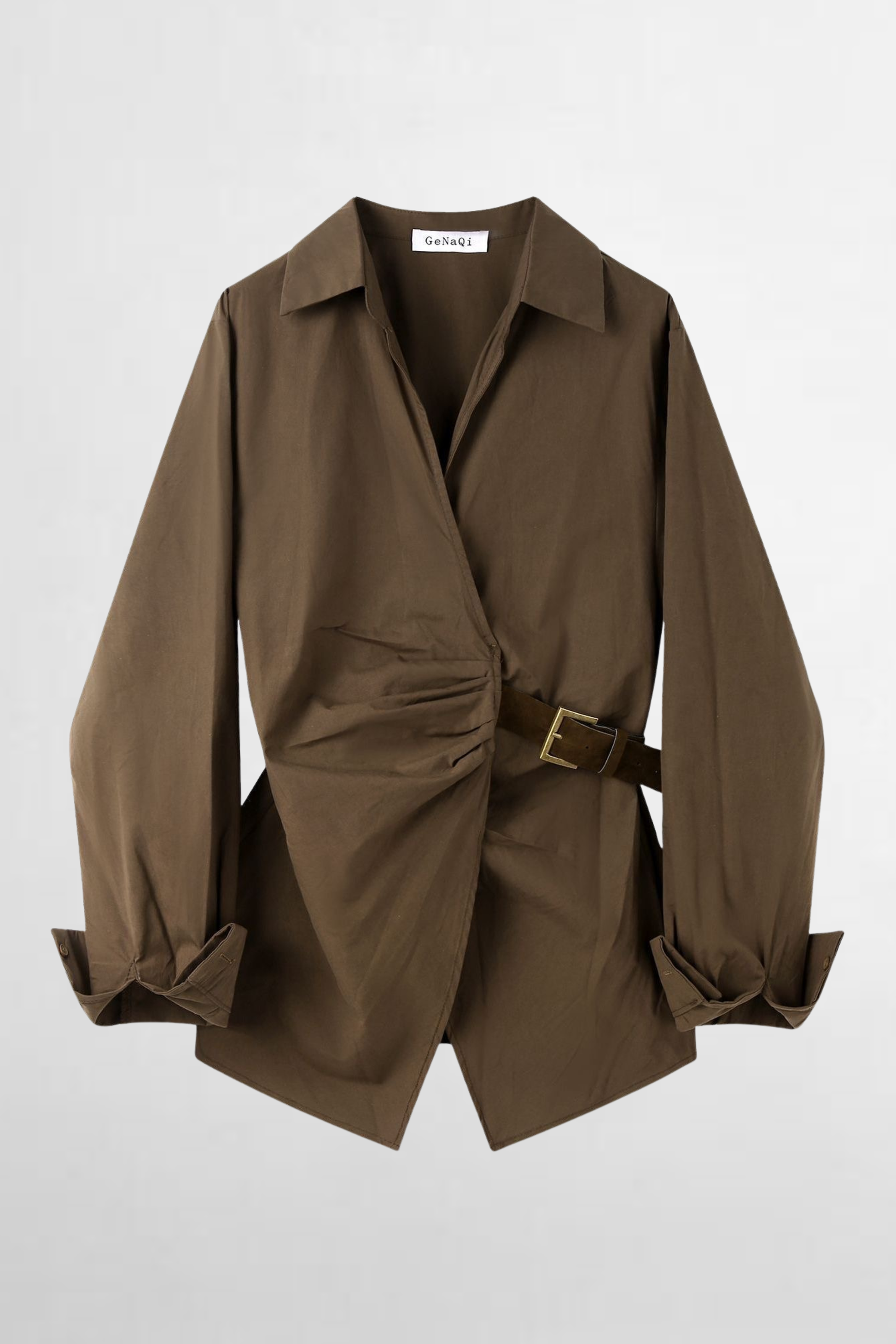 - Structured Belted Design – A statement shirt featuring an asymmetric front and a cinched waist with a sleek belt for a flattering, sculpted silhouette.