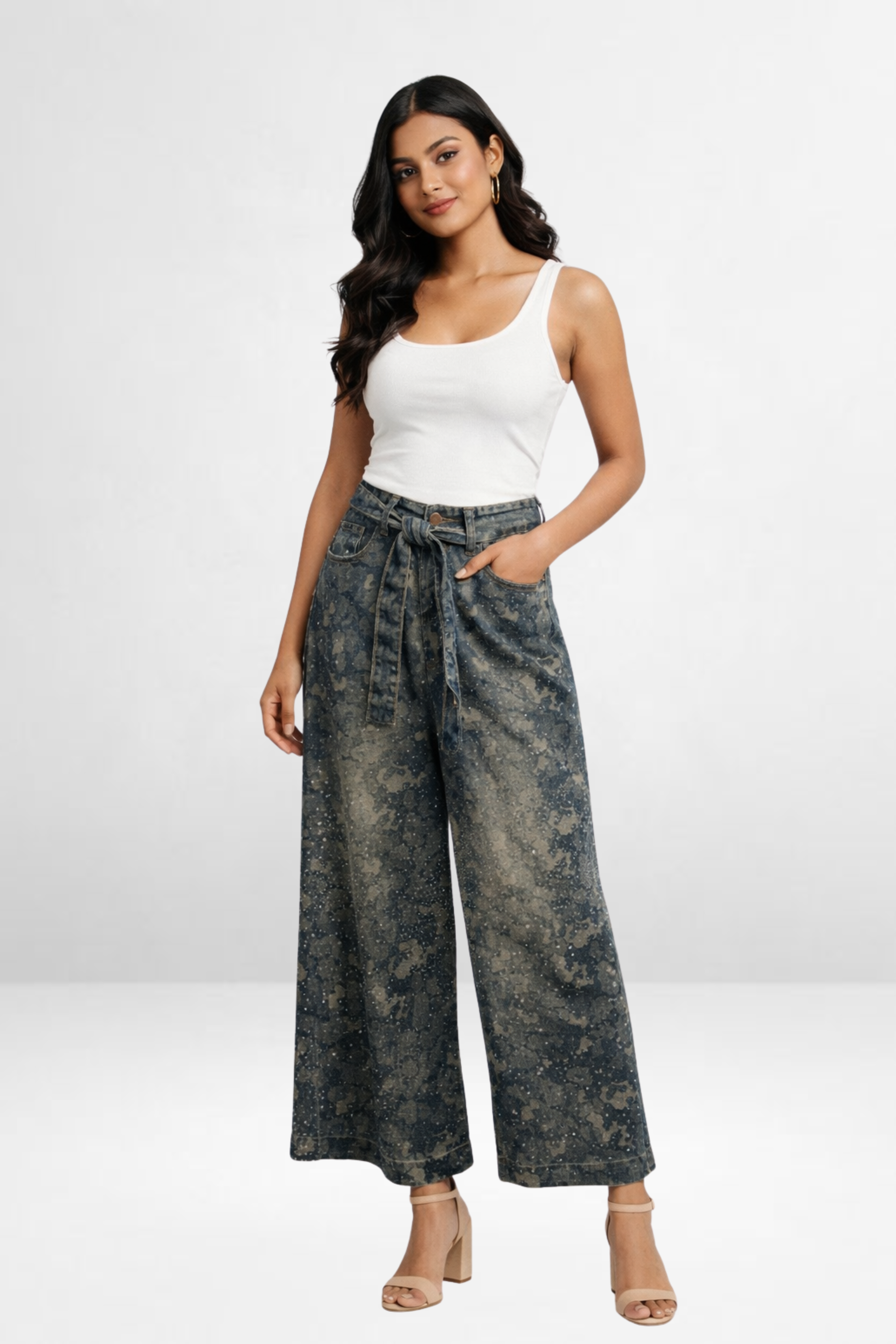 - All-Over Bling Printed Denim: Features a unique abstract print across the denim with bling details, giving it a bold, contemporary, and fashion-forward look.