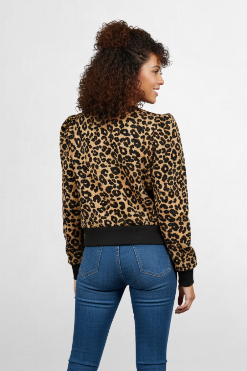 - Statement Pattern & Silhouette – This pullover blends a bold leopard print and checkered print with a sleek, modern fit. The slightly puffed shoulders add height and presence, while the relaxed-yet-tailored body gives it a refined casual profile. The ribbed hem creates a clean finish, helping the top sit neatly at the waist.