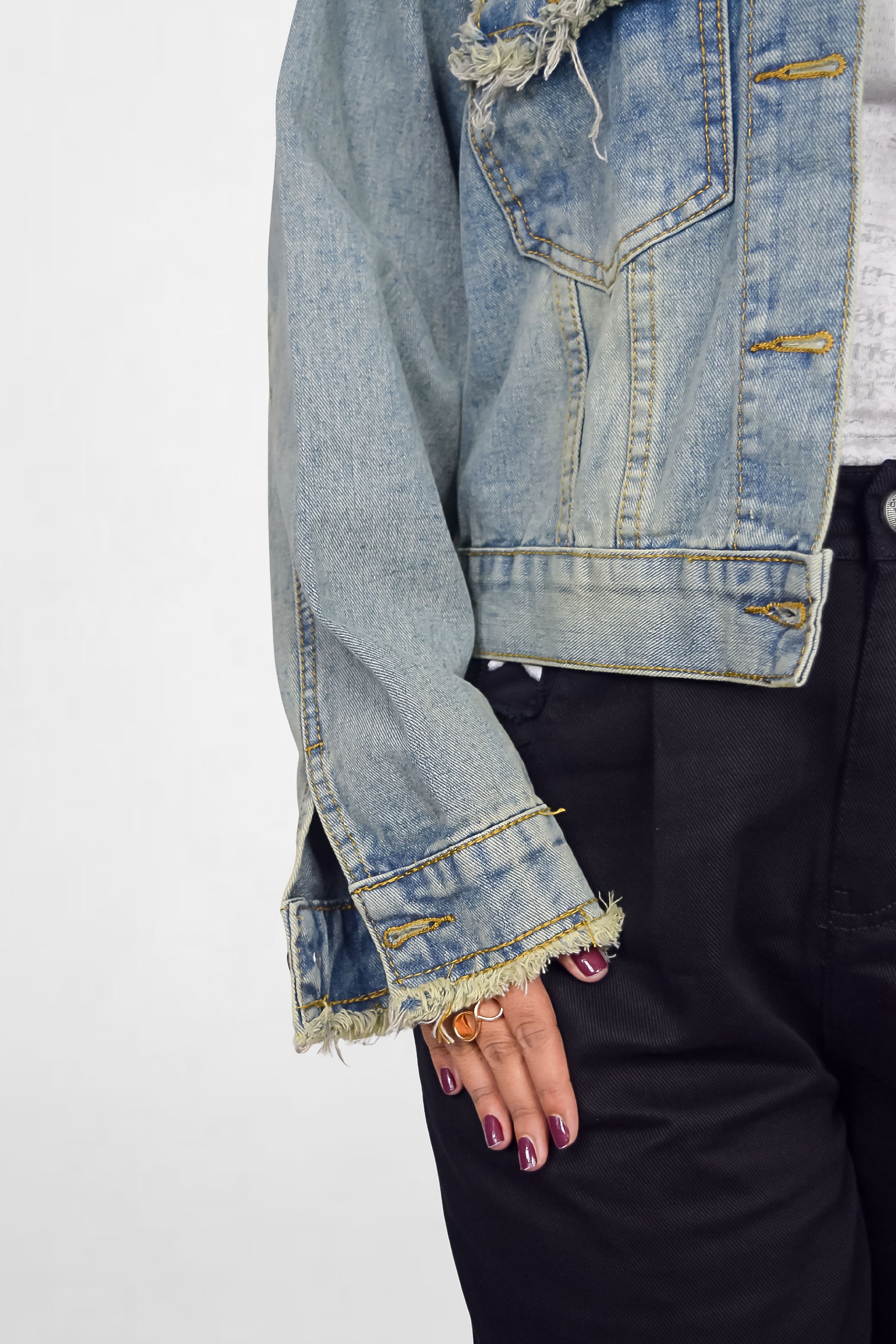 - Bold Distinction – This rugged denim jacket stands out with its frayed detailing and raw-edge finish, giving it that effortlessly cool, worn-in vibe. The contrast stitching and vintage wash add a touch of rebellious flair to a timeless silhouette.