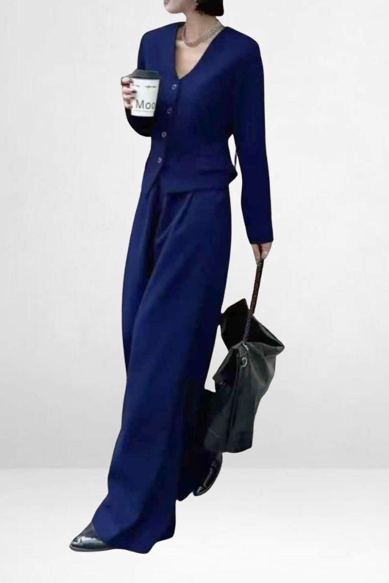 - Modern Minimalist Co-ord Set – A chic, tailored two-piece featuring a structured V-neck jacket and wide-leg trousers. Designed for effortless sophistication and everyday versatility.