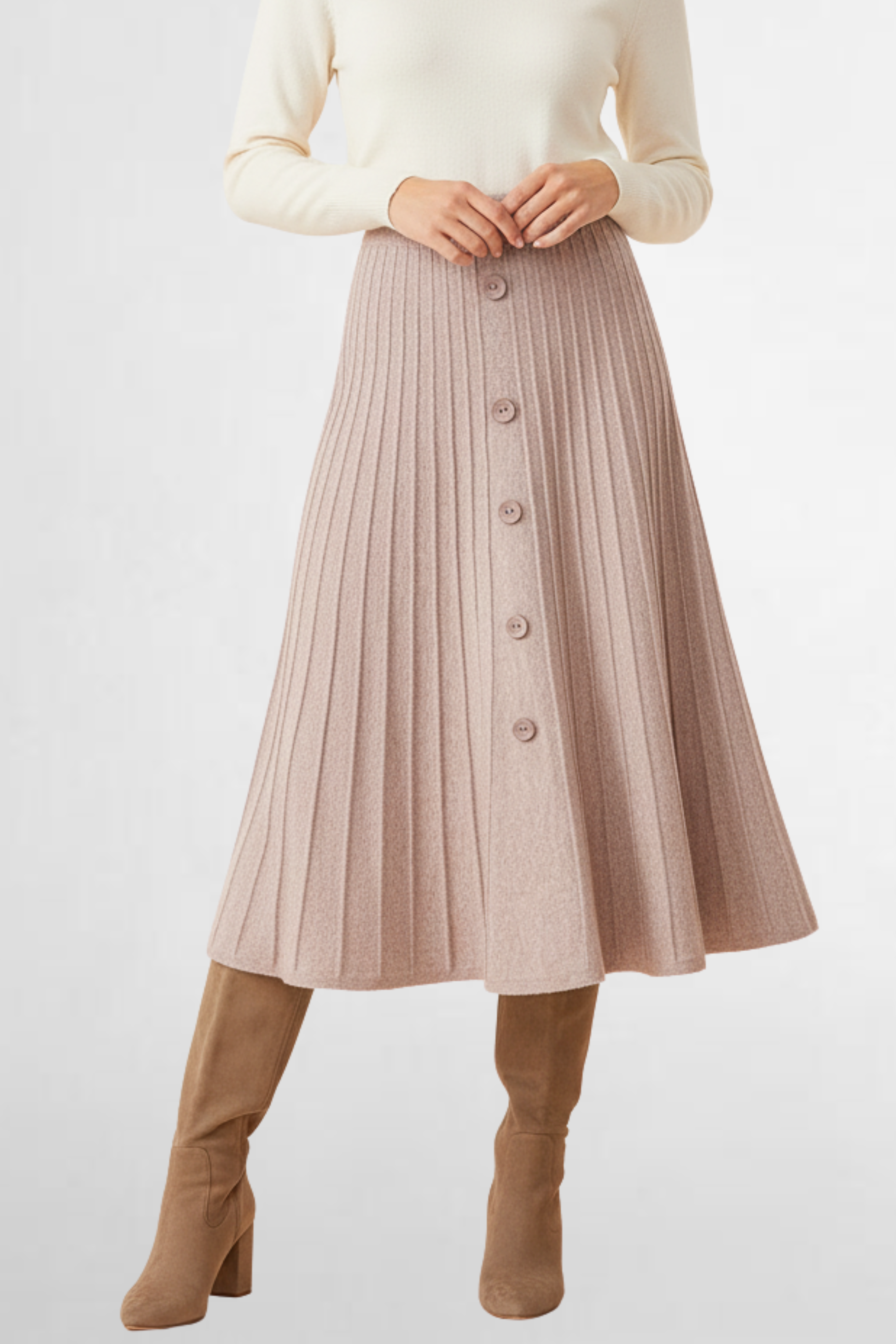 - Timeless Button-Front Charm – A classic A-line skirt designed with elegant pleats and front button detailing for a chic, sophisticated touch.