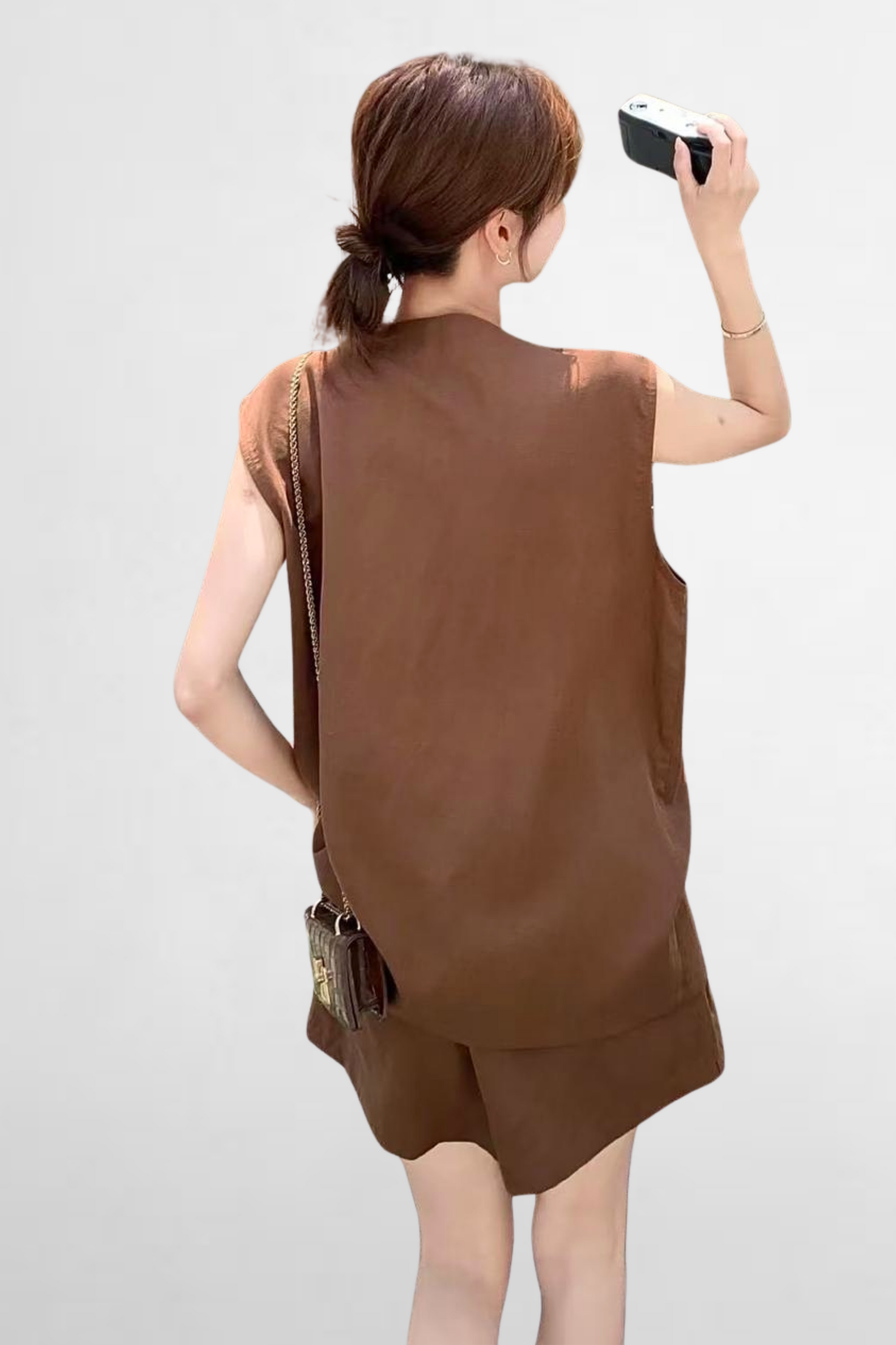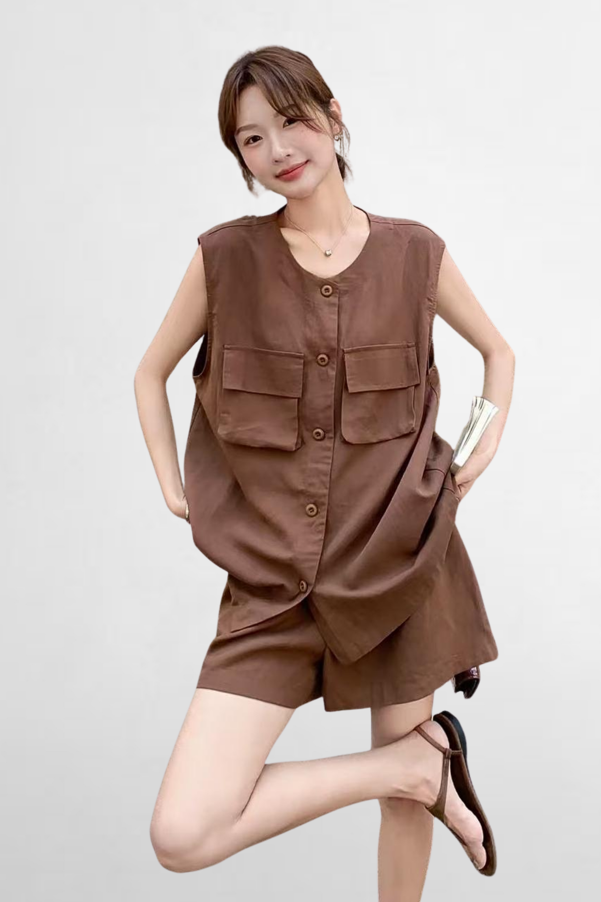 2-Piece Minimalist Co-ord Set – A sleeveless button-down top with front flap pockets paired with relaxed-fit shorts. Effortlessly chic and easy to wear for casual outings or laid-back weekends.