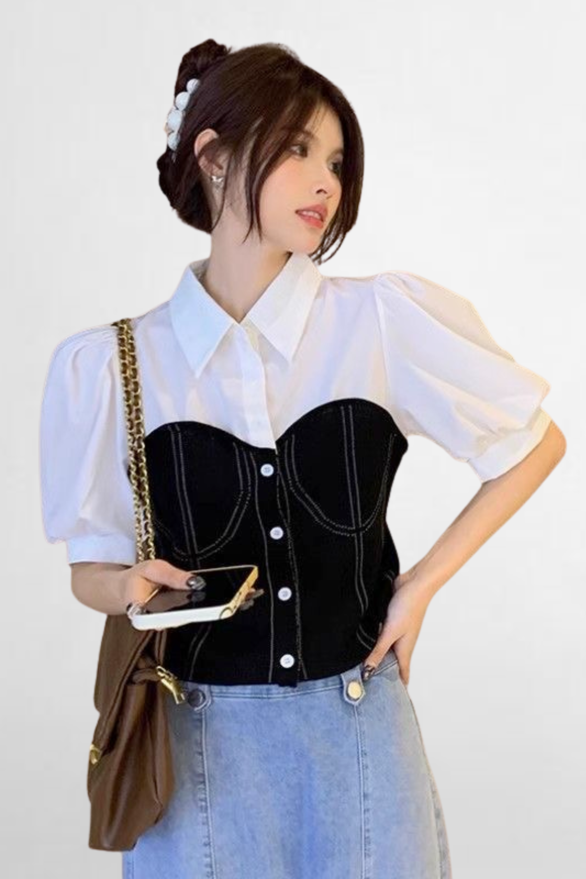- Layered Corset Illusion – A unique two-in-one blouse combining the structure of a corset with the elegance of a collared shirt, for an instantly elevated look.