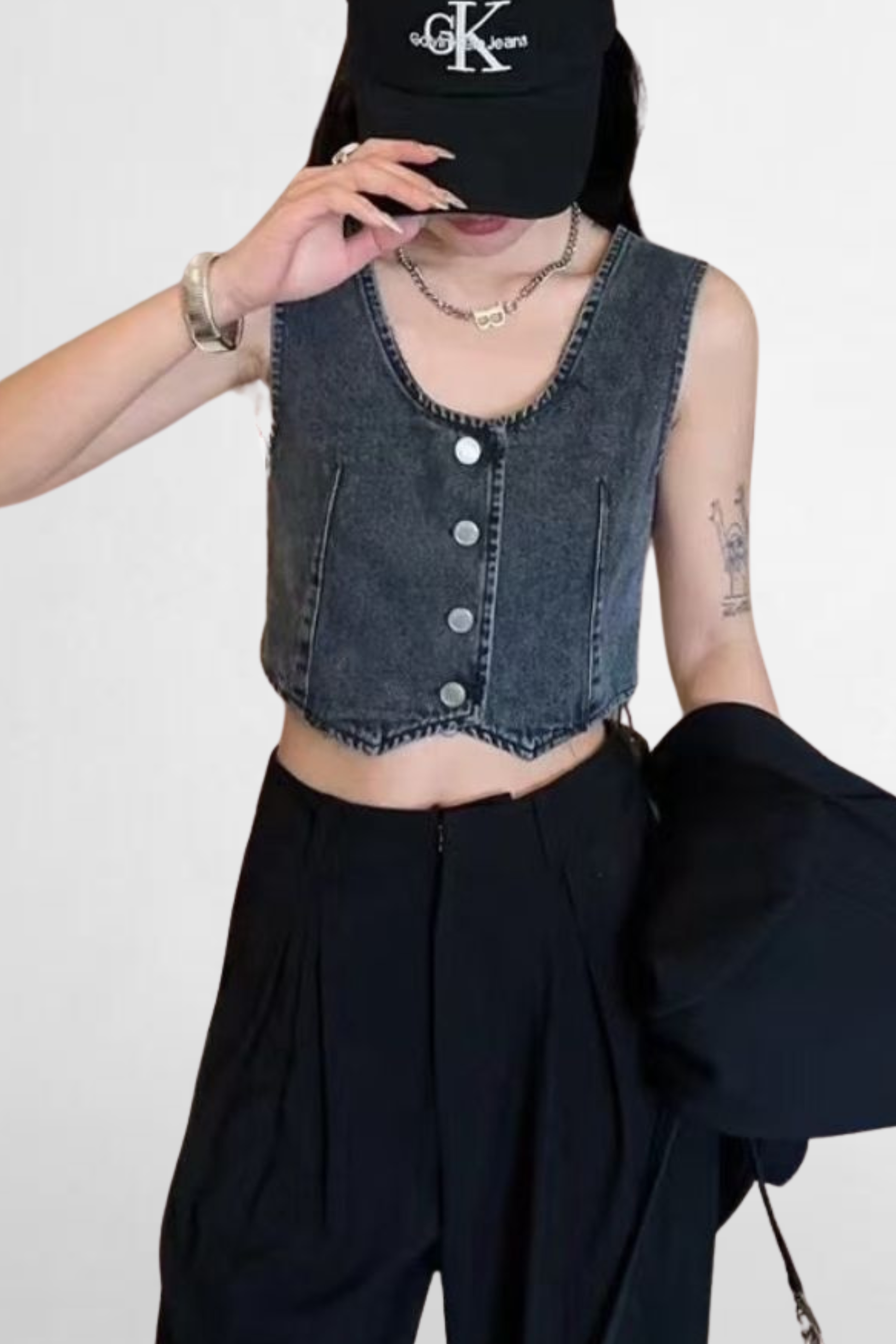 - Retro Revival – This cropped denim vest channels classic 90s vibes with a modern, edgy twist. The faded wash and raw hem give it a lived-in look that’s effortlessly cool and unique.